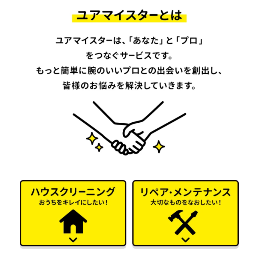 【PR】ユアマイスター いろいろな業界のプロフェッショナルたちと、 ものを大切にしたい人たちをつなぐ、サービス産業のIT化プラットフォームのご紹介です。プロならではの細やかな仕上がりです。 ◆人気カテゴリーから選ぶ エアコンクリーニング 水回りクリーニング 洗濯槽・洗濯機クリーニング カバン修理 車のパーツ取り付け 害虫・害獣駆除 引越し前後のおうちクリーニング エアコン取り付け お風呂・浴室クリーニング 換気扇クリーニング マットレスクリーニング ◆ご利用者の感想 親切丁寧 仕上がりはもちろん問題ないのですが、訪問時間を細かく連絡いただき、大変助かりました。また、いろいろと質問してしまった点も親切に答えていただきました。30代 いーじーさん エアコンクリーニング(壁掛型)8,050円 初めで利用しました 風呂、トイレ(タンク内込み)の清掃をお願いしました 時間は3時間半程で、ピカピカにして頂きましたトイレタンク内のカビは素人には難しく満足です次回はクーラー清掃をお願いしたいと思っています。50代 匿名希望 お風呂・浴室クリーニング2箇所 19,550円 ◆はじめての方へ 詳細はこちら ◆お支払い方法 決済方法は、クレジットカード支払い・QR決済・後払い決済※サービスによって一部の決済方法がご利用いただけない場合がございます。 お支払いについての詳細はここ 商材名 ユアマイスター運営者 MW※当サイトはアフィリエイトプログラムを利用し宣伝目的で作成しております。