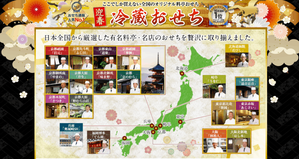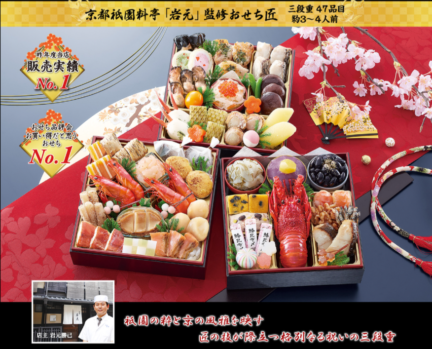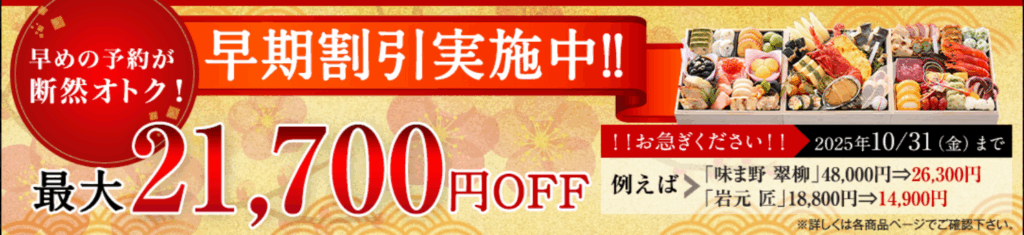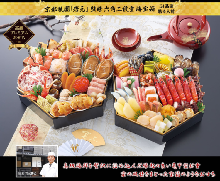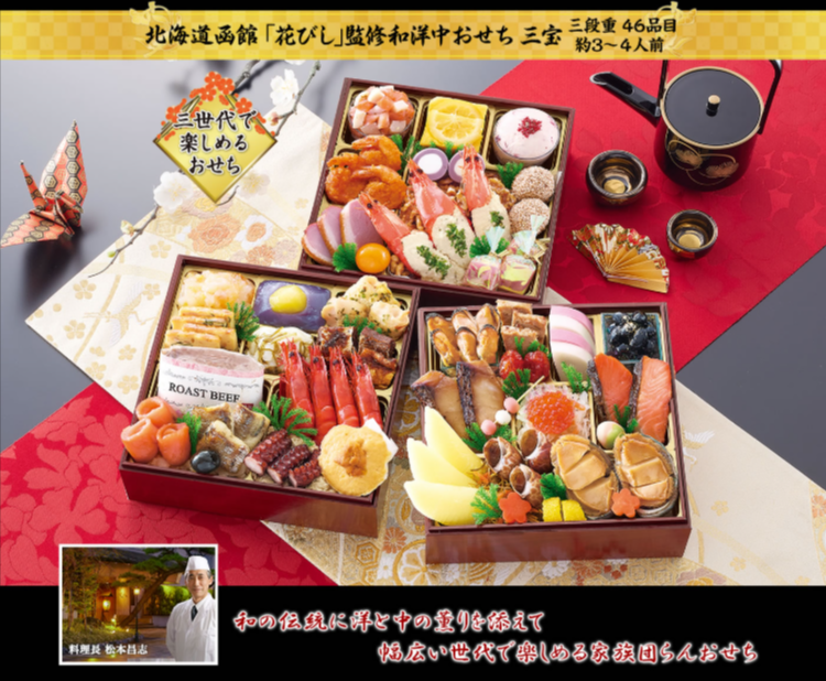 【PR】匠本舗 京都祇園 料亭監修 おせち 匠 価格 18,800円→14,900円(3,900円OFF)※10/31までの早割価格/税・送料込 2024年度販売し、非常に好評だったおせちです。今年の新作として「帆立貝柱燻製」「炙り桜鳟燻製」「紅白餅玉かんざし」「隠元含め煮」などが追加。迷ったらこちらのおせちがおすすめ。・三段重 47品目 約3~4人前 詳細はこちらへ 北海道函館有名ホテル 監修 和洋中おせち 三宝 価格 20,000円→16,800円(3,200円OFF)※10/31までの早割価格/税・送料込 和風・洋風・中華、海の幸からスイーツまで、幅広い料理を味わうことができます幅広い世代で楽しめるおせちです。・三段重 46品目 約3~4人前 詳細はこちらへ 京都祇園 料亭 監修 六角二段重海宝箱 価格 29,800円→20,800円(9,000円OFF)※10/31までの早割価格/税・送料込 珍しい六角形のお重に、カニ・エビ・あわびなど海の幸がたっぷり盛り込まれた高級プレミアムおせちです。・六角二段重 51品目 約4人前 詳細はこちらへ 詳細はこちらへ