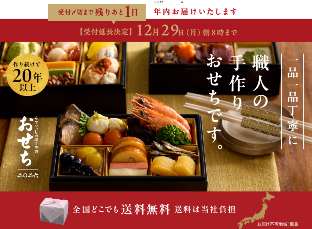 【PR】らでぃっしゅぼーや 毎年人気のおせちが今年もスタートしました! 国産素材で心から安心できるこだわりおせちは必見! 1年を通して全国各地から調達した厳選素材を使用し、 長年の経験と技による匠の技術のもと仕上げられた本格おせちです。 ほんとうに美味しいおせちで新年を明るく迎えましょう! リピーター続出!昨年ご購入いただいたお客様の声↓↓↓↓↓↓ 「無添加で安心していただけるおせちはなかなかないのでありがたい」「量的には丁度よかったです。味も優しく食べやすい味でした」 「一通りの食材が食べられて満足」 詳細はこちら 2人前の伝統的な品目を中心に、素材にこだわった彩り豊かな28品目を詰め合わせ。お客様のお声を元にさらにパワーアップさせた大満足間違いなしのお重です。 ここがスゴイおいしさの秘密 詳細はこちら 12,800円 (税込13,824円) お届け 12月30日(火)※お届け不可地域:離島 予約する 手作りのため数量限定となります。なくなり次第終了といたします。 冷凍おせちおいしく解凍する方法 1.届いたらすぐに冷凍庫へ風呂敷に包まれている場合は風呂敷を取って冷凍庫に入れてください。2.冷蔵庫で解凍するスペースに余裕がある場合は一段ずつ ばらして入れてください。3.常温に置く常温で30分〜1時間程度置くとよりおいしくお召し上がりいただけます。 サイズ・特定原材料 ●重箱サイズお重外寸(約):縦130×横130×高さ125mm(樹脂製重箱・三段)外箱サイズ(単位mm):縦155×横145×高さ190mm(白色段ボール)●特定原材料えび・くるみ・小麦・卵・乳成分●消費期限冷凍6ヶ月 予約する ■お支払い方法 クレジットカードによるお支払いになります。 詳細はこちら 商材名 らでぃっしゅぼーや運営者 MW※当サイトはアフィリエイトプログラムを利用し宣伝目的で作成しております。